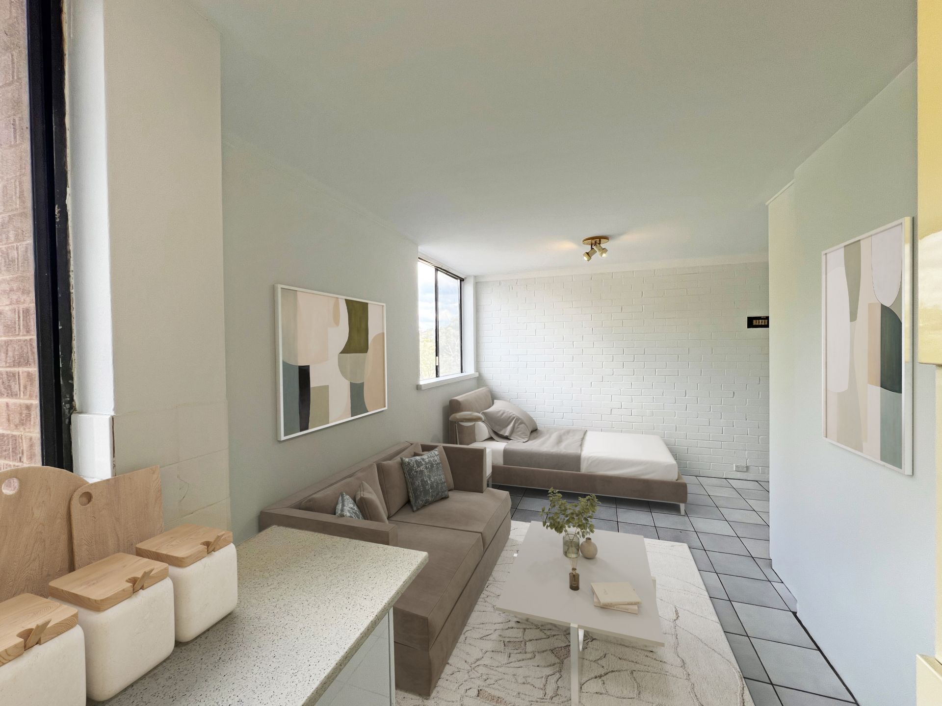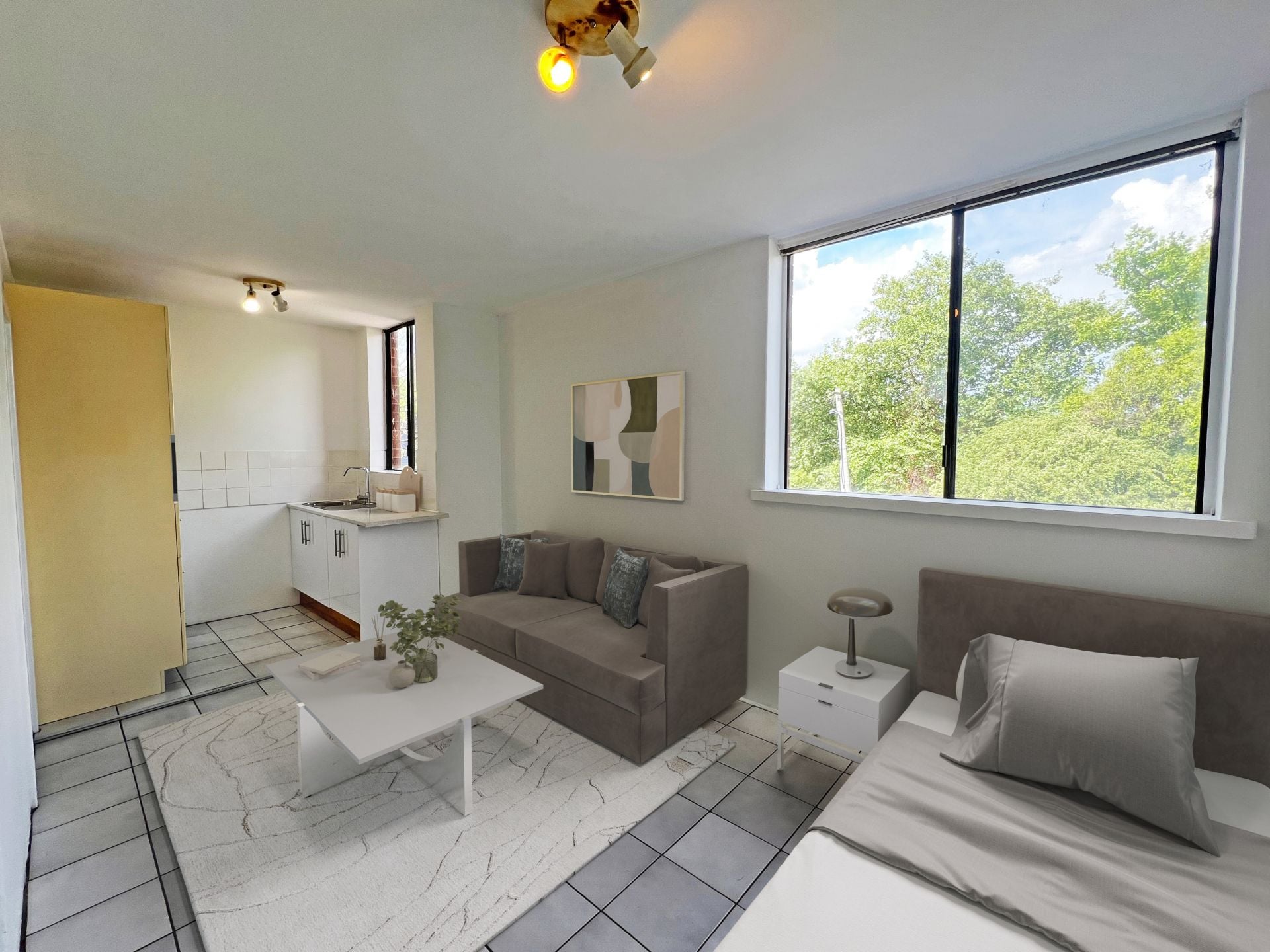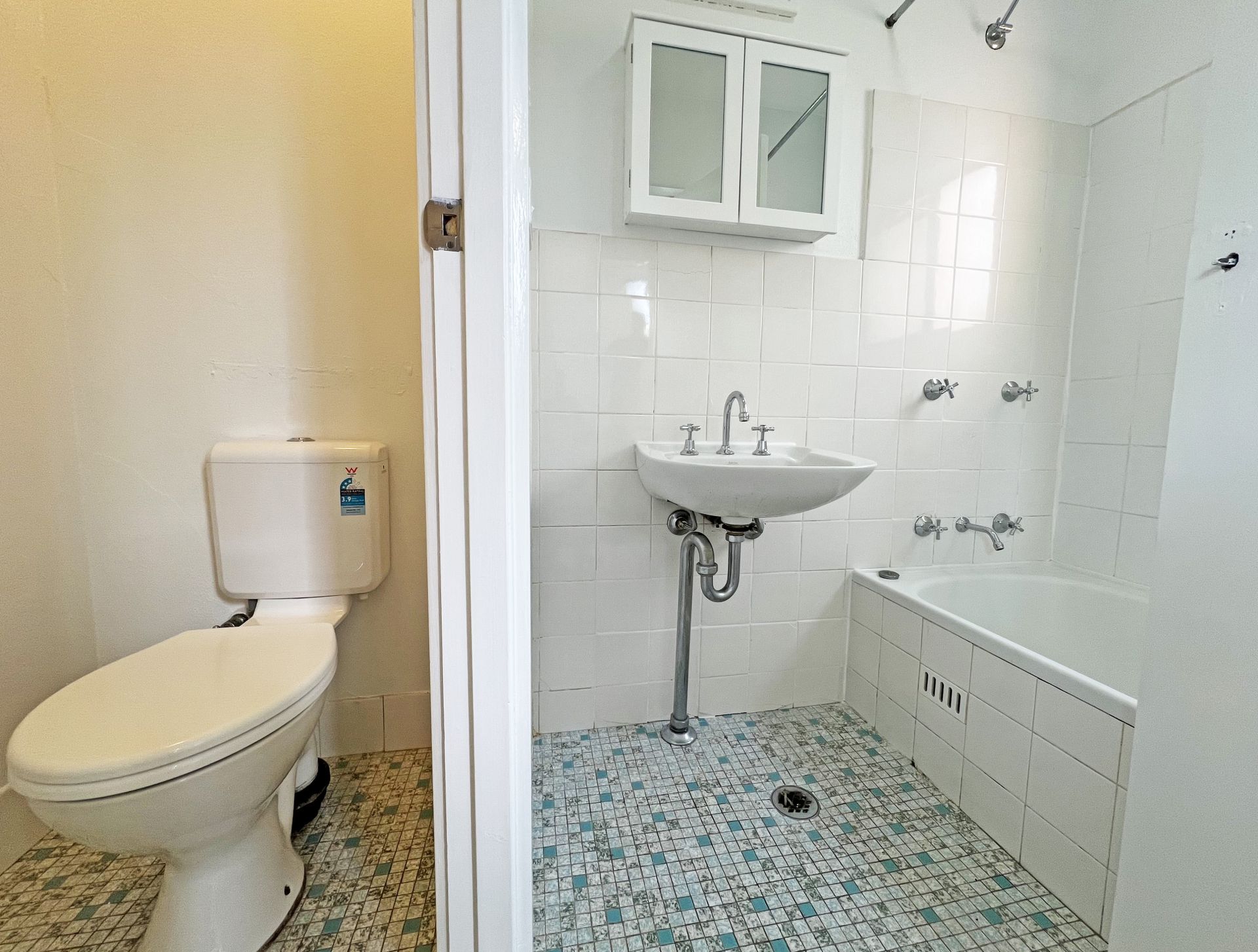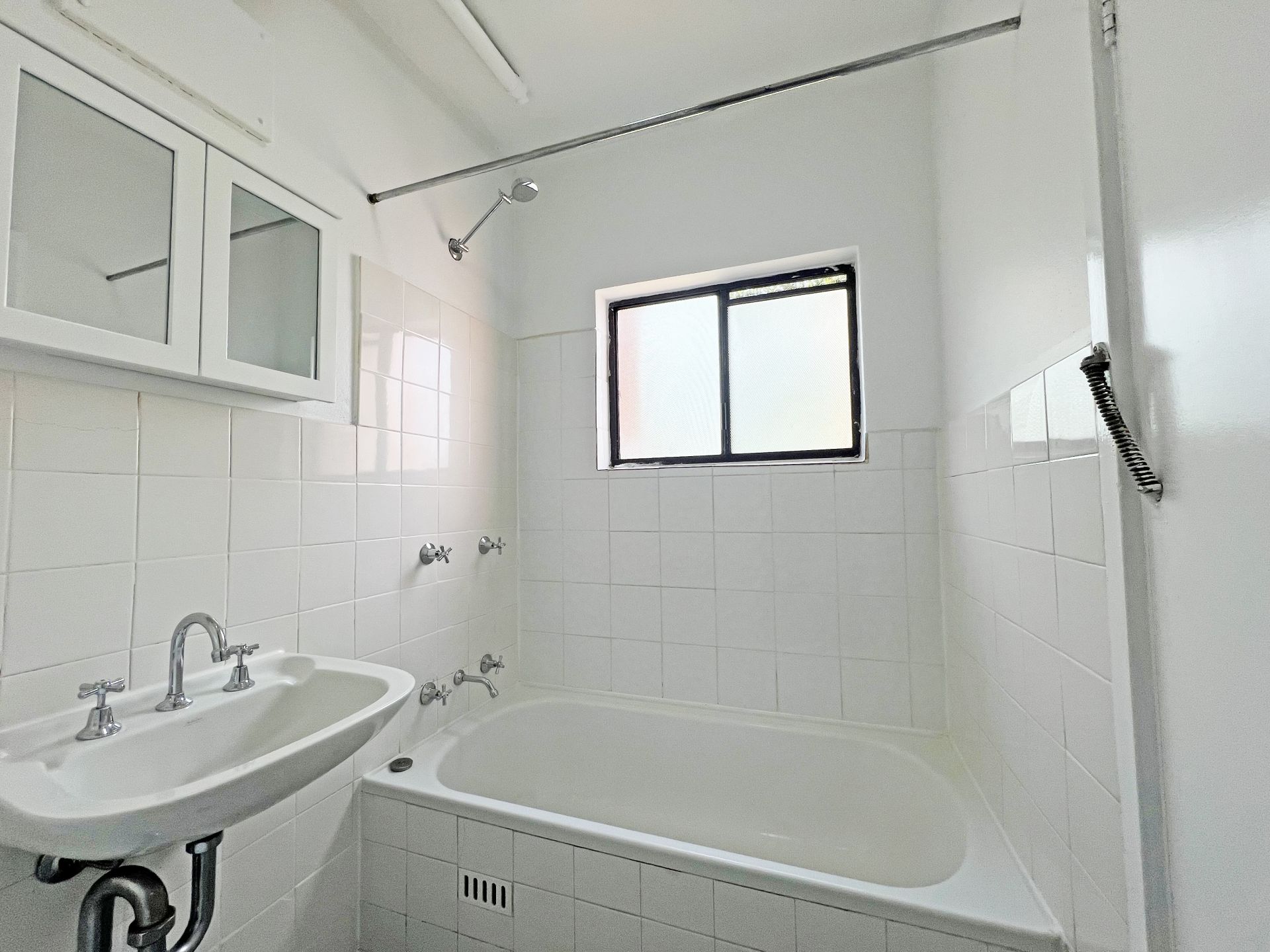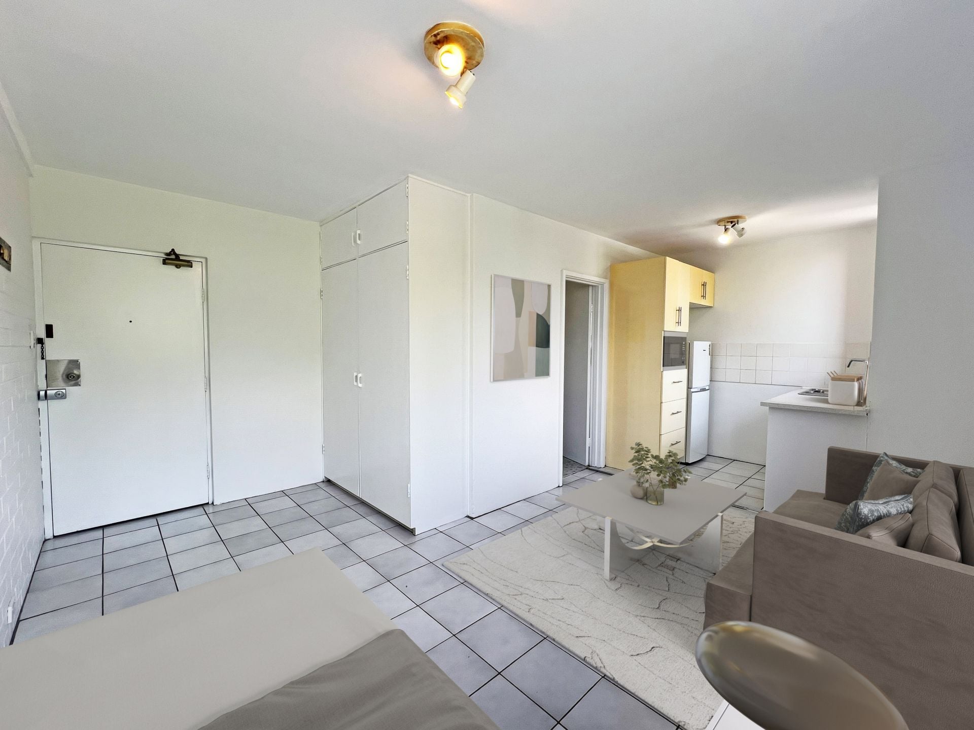 The apartment is located on the middle floor with a view over the adjacent parkland and is bathed in natural light. The clever design maximises the available space providing; a kitchenette, separate toilet, shower over the full size bath and a combined bedroom living area with a large built in cupboard.